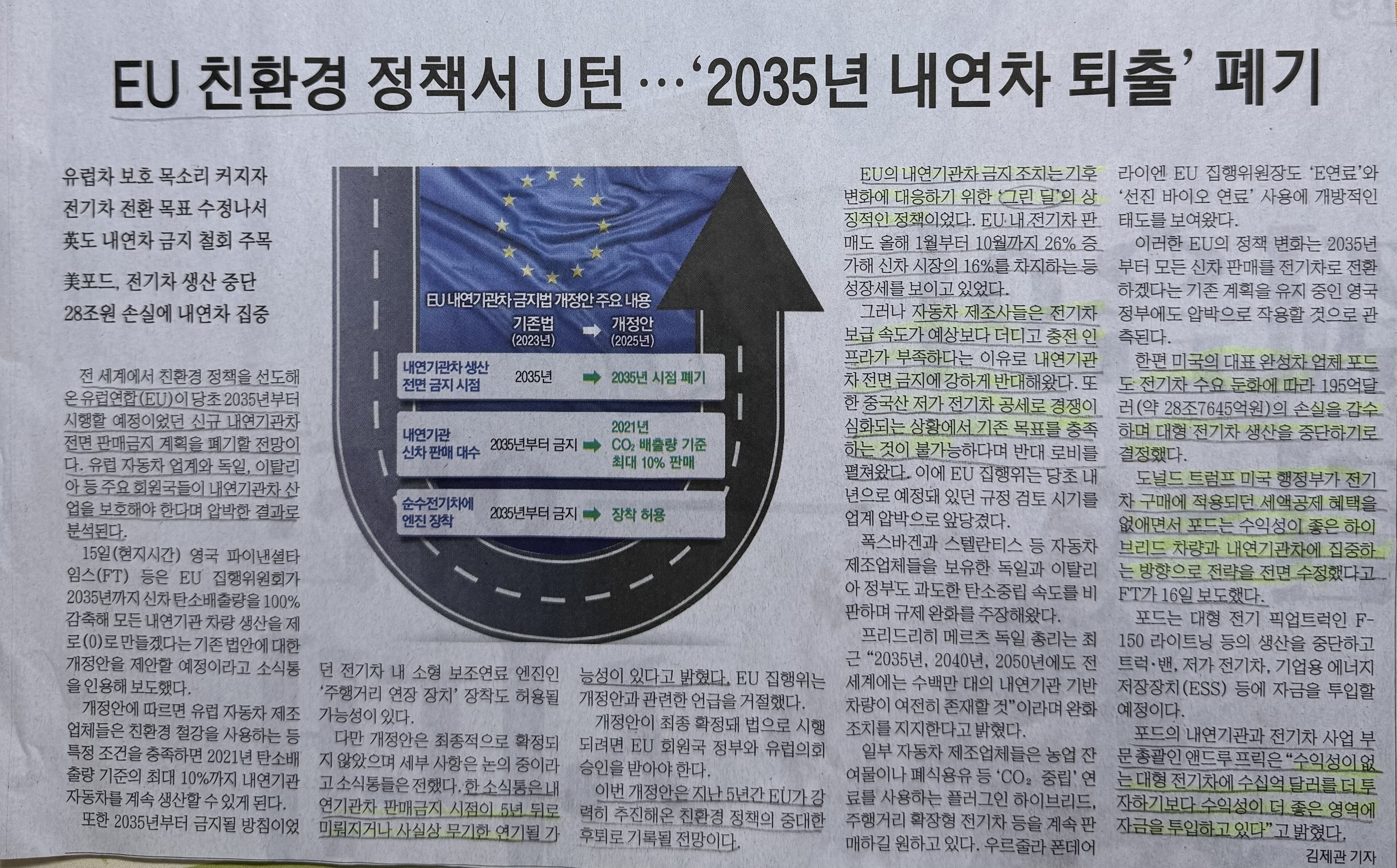 전 세게에서 친환경 정책을 선도해 온 유럽연합(EU)이 당초 2035년부터 시행할 예정이었던 신규 내연기관차 전면 판매금지 계획을 폐지할 전망입니다. 유럽 자동차 업계와 독일, 이탈리아 등 주요 회원국들이 내연기관차 산업을 보호해야 한다며 입박한 결과로 분석됩니다.